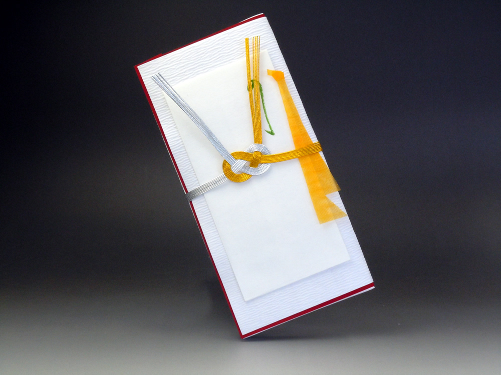 手漉き檀紙と金銀水引を用い、半紙を20枚包んだお多芽(ぽち袋無し)。結婚祝いのお返しに。